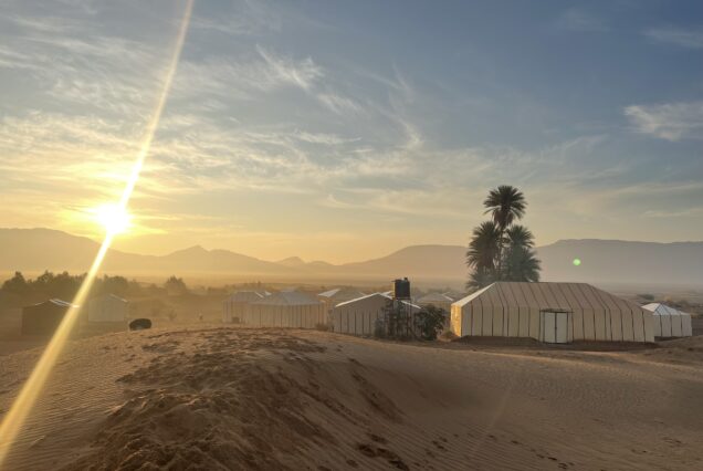 Nos levantaremos temprano para ver el amanecer sobre las dunas junto al campamento y disfrutar de un desayuno en el campamento. Luego, regresaremos al punto de encuentro en camello hasta el asfalto, donde nos esperará el chofer, o bien podemos volver directamente en coche desde el campamento.