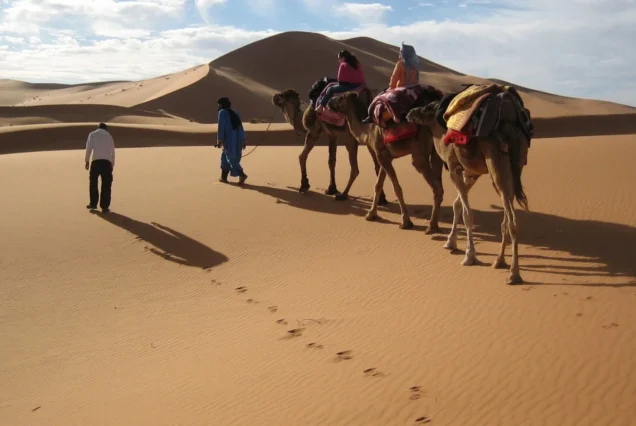 Desde aquí nos adentraremos en el desierto de Erg Chebbi, en Merzouga. Cambiaremos el vehículo por camellos (dromedarios) para disfrutar de una puesta de sol mágica sobre las dunas. Al caer la noche, llegaremos al campamento de haimas, donde viviréis una experiencia única: