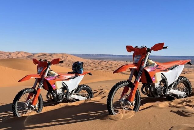Excursión y Tour en Moto KTM de Enduro en Merzouga – Erg Chebbi y Erg Ouzina: dunas infinitas, arena blanda, cordones de dunas y paisajes saharianos únicos.
