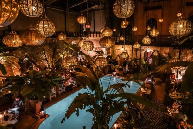 La velada en Gueliz suele comenzar con una cena en alguno de sus restaurantes de estilo contemporáneo, donde la cocina marroquí se fusiona con sabores internacionales para ofrecer platos innovadores y deliciosos en un ambiente elegante y acogedor. Aquí podrás degustar desde tajines tradicionales hasta propuestas más modernas y creativas, acompañadas de una selección de vinos y cócteles.