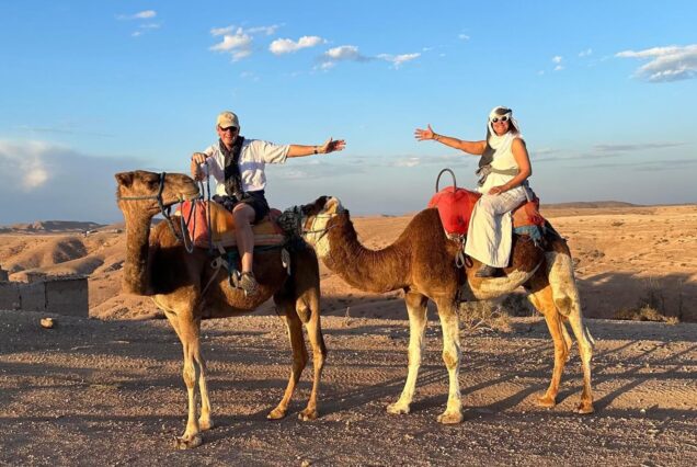Tras el almuerzo, continuaremos hacia el desierto de Agafay, un entorno árido y silencioso que ofrece un paisaje impresionante y único cerca de Marrakech. Allí podréis disfrutar de un paseo en camello por el desierto (15 € por persona, no incluido en el precio del viaje) y contemplar un hermoso atardecer entre las dunas y las rocas del desierto.