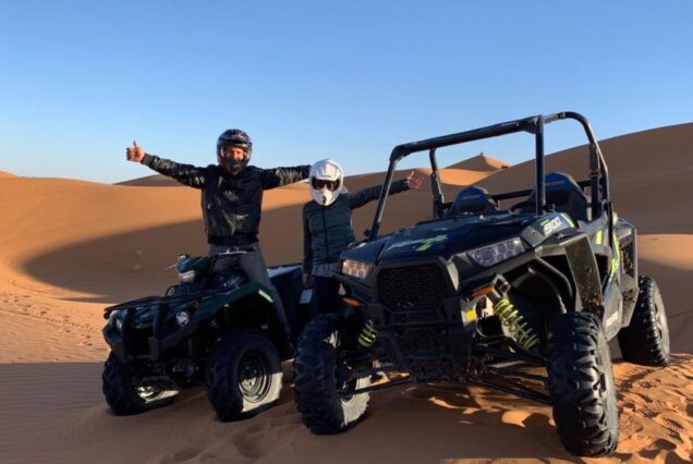 Opcionalmente, se pueden realizar excursiones en quad o buggy por las dunas de Erg Chebbi (no incluidas en el precio): Quad individual: 40€/hora, Quad doble: 60€/hora, Buggy doble: 120€/hora (con guía y gasolina incluida).