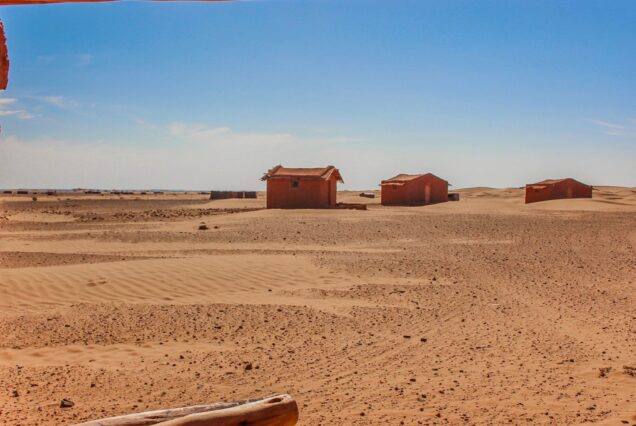 Después seguimos nuestra ruta en 4×4 a visitar los nómadas del desierto y tomamos un té con ellos y le dais una propina mínimo 5€, después iremos al pueblo abandonado Mifis (os dejamos en la entrada del pueblo para dar un paseo y os recogemos a la salida), importante núcleo de población minera que fue abandonado cuando la extracción dejó de ser rentable y desde un punto alto, tendremos unas magníficas vistas panorámicas. Allí hay unas minas a cielo abierto con perforaciones en la roca en forma de pozo o trinchera. Estos yacimientos están en activo y todavía en la actualidad, los trabajadores bajan a los pozos de hasta 50 metros de profundidad o más. Extraen plomo, khol. Después llegamos al poblado de Khamlia, donde viven los Gnawa, músicos de origen subsahariano (África Negra), que nos deleitaran con música y danzas, mientras saboreamos un té (whisky beréber) a la menta. Después podéis comprar un CD de su música vale 10€ o les dais una propina mínima de 5€. Seguiremos después hasta Taouz, desde donde cogemos la dirección hacia el pueblo de Ouzina al mediodía iremos a comer en casa de una familia beréber en el poblado de Ouzina (ensalada o fideos y pizza beréber y el Té de la bienvenida) hay opción también de descansar un rato hasta que baje el sol, podremos también tatuarse con Henna si os interesa por una persona especializada en tal arte hay que dejar una propina a la chica de Henna, si os interesa podéis ir a dar una vuelta por el pueblo de Ouzina y su oasis para a ver de que viven en esta zona.
