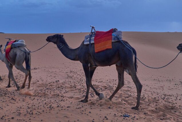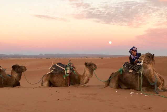 A las 07h30 salimos de la excursión 4 días y 3 noches comenzando desde Fez acabando o finalizado en Marrakech, desde vuestro Riad hacia Midelt por Ifrane, ciudad conocida como la Suiza de Marruecos por sus construcciones típicas de Suiza, allí pararemos unos 15 minutos para dar un paseo por la plaza del pueblo. Llegaremos al bosque de cedros milenarios de Azrou donde nos detendremos para disfrutar viendo los monos que viven en esa zona también le damos de comer (son originales de Gibraltar). Después continuaremos por las montañas del Medio Atlas hasta llegar a Midelt (capital de la manzana), donde pararemos para el almuerzo o podemos seguir hasta llegar a Rich. Seguiremos cruzando el puerto de Tizi Netlghmet (1907 m), llegaremos después a las gargantas de Ziz, hasta llegar al valle de Ziz, donde haremos una Parada para ver la panorámica del valle y hacer unas fotos, y después llegaremos a la ciudad de Erfoud, donde cogemos la dirección al desierto. Por la tarde llegaremos a Merzouga, donde cambiaremos el vehículo por los dromedarios para ir a ver el atardecer en las dunas de Erg Chebbi y pasar la noche en Haimas y disfrutar del silencio de este desierto famoso.